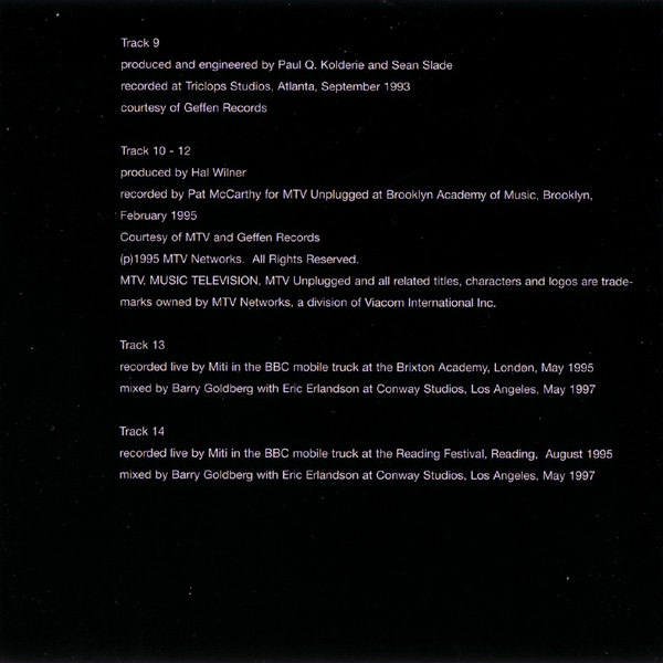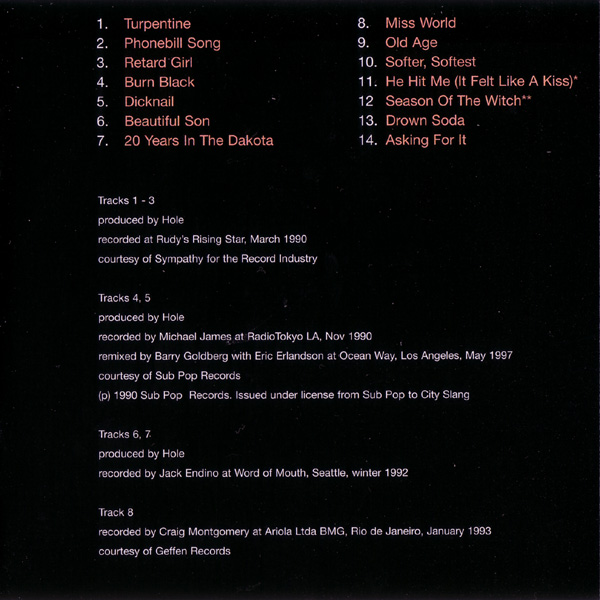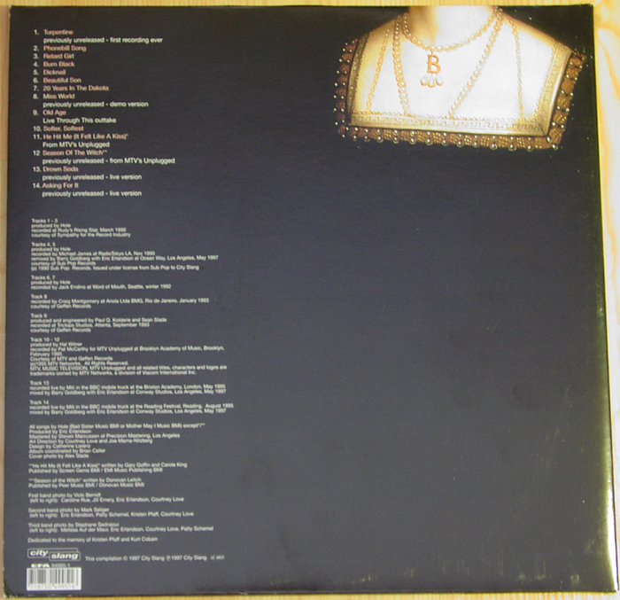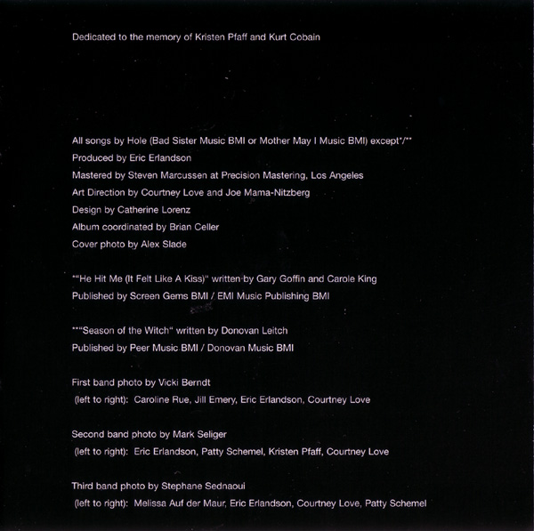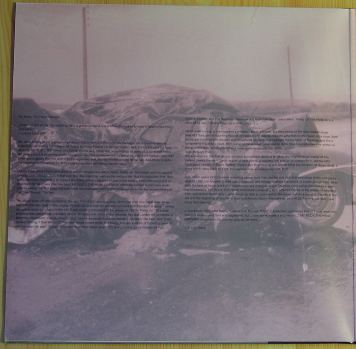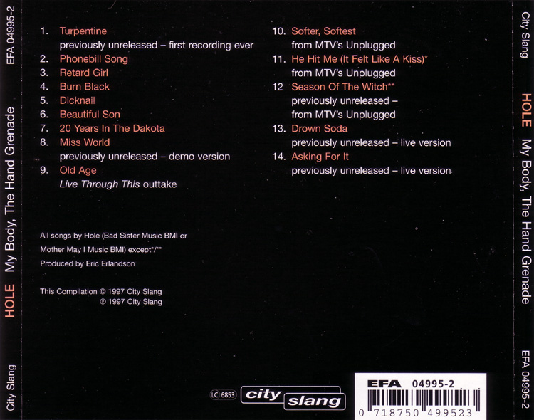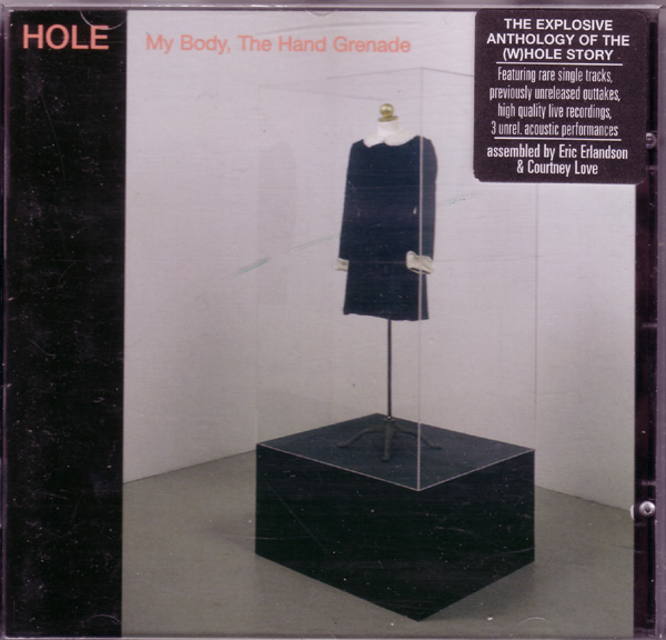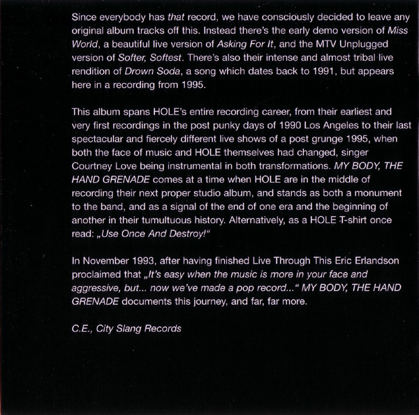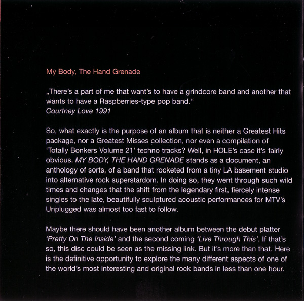 - - - - - - - - - - - - - GENERAL INFO Genre: Hardcore/Punk Label: City Slang Date: October 28, 1997 Musicians: Courtney Love - vocals, guitars Eric Erlandson - guitars Jill Emery - bass Kristen Pfaff - bass, piano, backup vocals Leslie Hardy - bass Melissa Auf Der Maur - bass, backup vocals Carolyn Rue - drums Patty Schemel - drums The explosive anthology of the (w)hole story. Featuring rare single tracks, previously unreleased outtakes, high quality live recordings, 3 unrel. acoustic performances assembled by Eric Erlandson & Courtney Love All songs by Hole (Bad Sister Music BMI or Mother May I Music BMI) except */** Produced by Eric Erlandson Mastered by Steven Marcussen at Precision Mastering, Los Angeles Art Direction by Courtney Love and Joe Mama-Nitzberg Design by Catherine Lorenz Album coordinated by Brian Celler Cover photo by Alex Slade *"He Hit Me (It Felt Like A Kiss)" written by Gary Goffin and Carole King Published by Screen Gems BMI / EMI Music Publishing BMI **"Season Of The Witch" written by Donovan Leitch Published by Peer Music BMI / Donovan Music BMI First band photo by Vickie Berndt (left to right): Caroline Rue, Jill Emery, Eric Erlandson, Courtney Love Second band photo by Mark Selinger (left to right): Eric Erlandson, Patty Schemel, Kristen Pfaff, Courtney Love Third band photo by Stephane Sednaoui (left to right): Melissa Auf der Maur, Eric Erlandson, Courtney Love, Patty Schemel Tracks 1 - 3 produced by Hole recorded at Ruby's Rising Star, March 1990 courtesy of Sympathy for the Record Industry Tracks 4, 5 produced by Hole recorded by Michael James at RadioTokyo, LA, Nov 1990 remixed by Barry Goldberg with Eric Erlandson at Ocean Way, Los Angeles, May 1997 courtesy of Sub Pop Records (p) 1990 Sub Pop Records. Issued under license from Sub Pop to City Slang Tracks 6, 7 produced by Hole recorded by Jack Endino at Word of Mouth, Seattle, winter 1992 Track 8 recorded by Craig Montgomery ar Ariola Ltda BMG, Rio de Janeiro, January 1993 courtesy of Geffen Records Track 9 produced and engineered by Paul Q. Kolderie and Sean Slade recorded at Triclops Studios, Atlanta, September 1993 courtesy of Geffen Records Track 10 - 12 produced by Hal Wilner recorded by Pat McCarthy for MTV Unplugged at Brooklyn Academy of Music, Brooklyn, February 1995 Courtesy of MTV and Geffen Records 8p)1995 MTV Networks. All Rights Reserved. MTV, MUSIC TELEVISION, MTV Unplugged and all related titles, characters and logos are trademarks owned by MTV Networks, a division of Viacom International Inc. Track 13 recorded live by Miti in the BBC mobile truck at Brixton Academy, London, May 1995 mixed by Gary Goldberg with Eric Erlandson at Conway Studios, Los Angeles, May 1997 Track 14 recorded live by Miti in the BBC mobile truck at the Reading Festival, Reading, August 1995 mixed by Gary Goldberg with Eric Erlandson at Conway Studios, Los Angeles, May 1997 Dedicated to the memory of Kristen Pfaff and Kurt Cobain Liner notes: My Body, The Hand Grenade "There's a part of me that want's to have a grindcore band and another that wants to have a Raspberries-type pop band." Courtney Love 1991 So, what exactly is the purpose of an album that is neither a Greatest Hits package, nor a Greatest Misses collection, nor even a compilation of 'Totally Bonkers Volume 21' techno tracks? Well, in HOLE's case it's fairly obvious. MY BODY, THE HAND GRENADE stands as a document, an anthology of sorts, of a band that rocketed from a tiny LA basement studio into alternative rock superstardom. In doing so, they went through such wild times and changes that the shift from the legendary first, fiercely intense singles to the late, beautifully sculptured acoustic performances for MTV's Unplugged was almost too fast to follow. Maybe there should have been another album between the debut platter 'Pretty On The Inside' and the second coming 'Live Through This'. If that's so, this disc could be seen as the missing link. But it's more than that. Here is the definitive opportunity to explore the many different aspects of one of the world's most interesting and original rock bands in less than one hour. MY BODY, THE HAND GRENADE offers the earliest brutal noise work-outs as well as the first steps towards more accomplished writing and continues on to the first songsmithery of the 'Live Through This' era. The album kicks off with Turpentine, the very first HOLE recording ever, which has until now never been released. The first two hard to find singles, Retard Girl and Dicknail, are also included with attendant B-sides. Gaining wild press acclaim, notably in the UK, it was nothing compared to the praise for 1991's Pretty On The Inside, probably that year's most important album. To quote one of our press releases, this was "where the extremes of abjection, obsession, trauma, atrocity and, most importantly, humanity collide." Certainly The New York Times agreed, making it their Album Of The Year, whilst others wrote of it being "the very best bit of fucked up rock 'n' roll I've heard all year" (Sharon O'Connell in Melody Maker, Sept. '91) and "...in the grand tradition of Patti Smith's 'Horses' and The Ramones, Television and New York Dolls' debut discs, Pretty On The Inside is in a class of its own." (Edwin Pouncey in NME, Sept. '91) World-wide touring, a marriage and a maternity break followed, but the release of the now deleted single Beautiful Son, and it's haunting flipside 20 Years In The Dakota, focused attention on the music once more. Both tracks are found here in remixed and remastered versions, and highlight the evolution of Courtney and Eric's songwriting in just two years, from some of the scariest, most painful three chord cacophonies ever written to the sophisticated, accomplished and more dynamic sounds that led to 'Live Through This'. Since everybody has that record, we have consciously decided to leave any original album tracks off this. Instead there's the early demo version of Miss World, a beautiful live version 