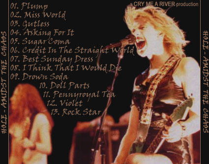 TITLE: Amidst The Chaos DATE/VENUE: 07/29/95, Downey Stadium, Randall's Island, New York, NY RUNNING TIME: - SOUND QUALITY: - SOURCE: Video tape recorded onto the computer, then copied to cd-r. BOOTLEG BY: Cry Me A River ARTWORK BY: Cry Me A River SETLIST: 1. Plump 2. Miss World 3. Gutless 4. Asking For It 5. Sugar Coma 6. Credit In The Straight World 7. Best Sunday Dressv 8. I Think That I Would Die 9. Drown Soda 10. Doll Parts 11. Pennyroyal Tea 12. Violet 13. Rock Star ADDITIONAL INFO: This show was part of the Lollapalooza tour. BOOTLEG REVIEW: - ARTWORK: