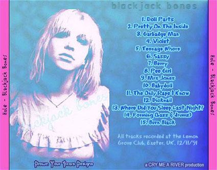 TITLE: Blackjack Bones DATE/VENUE: 12/11/91, Lemon Grove Club, Exeter, UK RUNNING TIME: - SOUND QUALITY: - SOURCE: Video tape recorded onto the computer, then copied to cd-r. BOOTLEG BY: Cry Me A River ARTWORK BY: Drown Your Scars SETLIST: 1. Doll Parts 2. Pretty On The Inside 3. Garbadge Man 4. Violet 5. Teenage Whore 6. Sassy 7. Berry 8. Pee Girl 9. Mrs Jones 10. Babydoll 11. The Only Rape I Know 12. Dicknail 13. Where Did You Sleep Last Night? 14. Forming (bass & drums) 15. Burn Black ADDITIONAL INFO: - BOOTLEG REVIEW: - ARTWORK: