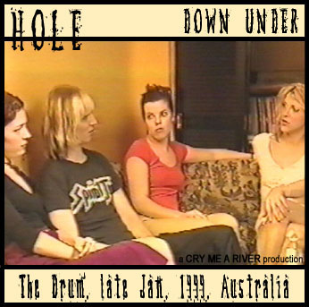 TITLE: Down Under DATE/VENUE: 01/??/99, Australia RUNNING TIME: - SOUND QUALITY: - SOURCE: Video tape recorded onto the computer, then copied to cd-r. BOOTLEG BY: Cry Me A River ARTWORK BY: Cry Me A River SETLIST: 1. Interview ADDITIONAL INFO: Features an interview with the whole band from The Drum, late January, 1999, during the Australian tour. BOOTLEG REVIEW: - ARTWORK:
