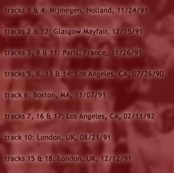 TITLE: Dripping Rosaries DATE/VENUE: Tracks 1 & 4: Nijmegeb, Holland, 11/24/91. Tracks 2 &12: Glasgow Mayfair, 12/15/91. Tracks 3, 9 & 11: Paris, France, 11/26/91. Tracks 5, 8, 13 & 14: Los angeles, CA, 07/26/90. Track 6: Boston, MA, 11/07/91. Tracks 7, 16 & 17: Los angeles, CA, 02/11/92. Track 10: London, UK, 08/21/91. Tracks 15 & 18: London, UK, 12/12/91. RUNNING TIME: - SOUND QUALITY: - SOURCE: Cd/Cd-r to cd-r. BOOTLEG BY: Cry Me A River ARTWORK BY: Cry Me A River SETLIST: 1. Teenage Whore 2. Babydoll 3. Garbadge Man 4. Sassy 5. Good Sister/Bad Sister 6. Mrs Jones 7. Berry 8. Starbelly 9. Pretty On The Inside 10. Clouds 11. Burn Black 12. Dicknail 13. Phonebill Song 14. Retard Girl 15. The Only Rape I Know 16. Beautiful Son 17. Pale Blue Eyes 18. Where Did You Sleep Last Night? ADDITIONAL INFO: This is a compilation of all tracks from the album 'Pretty On The Inside' live (except Loaded that was never played live), and some other tracks that were played during that early tour. BOOTLEG REVIEW: - ARTWORK: