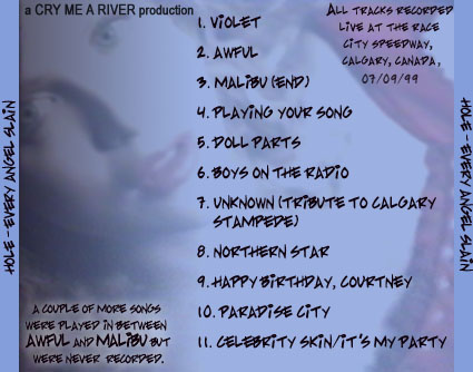 TITLE: Every Angel Slain DATE/VENUE: 07/09/99, Race City Speedway, Calgary, Canada. RUNNING TIME: - SOUND QUALITY: - SOURCE: Audio tape transferred to cd-r. BOOTLEG BY: Cry Me A River ARTWORK BY: Cry Me A River SETLIST: 1. Violet 2. Awful 3. Malibu (end) 4. Playing Your Song 5. Doll Parts 6. Boys On The Radio 7. Unknown (Tribute To Calgary Stampede) 8. Northern Star 9. Happy Birthday, Courtney 10. Paradise City 11. Celebrity Skin/It's My Party ADDITIONAL INFO: A couple of more songs were played in between Awful and Malibu, but were never recorded. I believe them to be Pretty On The Inside, Heaven Tonight, Miss World and _maybe_ Reasons To Be Beautiful. This show was played on Courtney's birthday. Comes in a red jewelcase. BOOTLEG REVIEW: - ARTWORK: