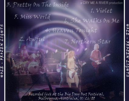 TITLE: Frozen Lights DATE/VENUE: 01/26/99, Big Day Out Festival, Melbourne, Australia. RUNNING TIME: - SOUND QUALITY: - SOURCE: Cd to cd-r. BOOTLEG BY: Cry Me A River ARTWORK BY: Cry Me A River SETLIST: 1. Violet 2. Awful 3. Pretty On The Inside 4. Heaven Tonight 5. Miss World 6. She Walks Over Me 7. Northern Star ADDITIONAL INFO: Due to the poor quality of the other bootlegs featuring this show, I hunted down all the maximum quality tracks I could find, and put them on this cd. Unfortunately, I couldn't find all tracks. BOOTLEG REVIEW: - ARTWORK: