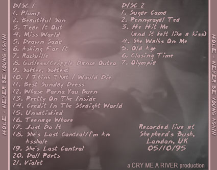 TITLE: Never Be Young Again DATE/VENUE: 05/10/95, Shepherd's Bush, London, UK RUNNING TIME: - SOUND QUALITY: - SOURCE: Audio tape transferred to cd-r. BOOTLEG BY: Cry Me A River ARTWORK BY: Cry Me A River SETLIST: Disc 1: 1. Plump 2. Beautiful Son 3. Tear It Out 4. Miss World 5. Drown Soda 6. Asking For It 7. Rockville 8. Gutless/Cripple Dance Outro 9. Softer, Softest (cut) 10. I Think That I Would Die 11. Best Sunday Dress 12. Whose Porno You Burn 13. Pretty On The Inside 14. Credit In The Straight World 15. Unsatisfied 16. Teenage Whore (fade in) 17. Just Do It 18. She's Lost Control/I'm An Asshole 19. She's Lost Control 20. Doll Parts 21. Violet Disc 2: 1. Sugar Coma 2. Pennyroyal Tea 3. He Hit Me (and it felt like a kiss) 4. She Walks On Me 5. Old Age 6. Closing Time 7. Olympia ADDITIONAL INFO: - BOOTLEG REVIEW: - ARTWORK:
