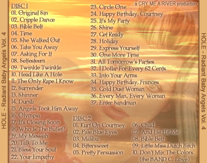 TITLE: Radiant Baby Angels, Vol. 4 DATE/VENUE: Various RUNNING TIME: - SOUND QUALITY: - SOURCE: Audio tape transferred to cd-r. BOOTLEG BY: Cry Me A River ARTWORK BY: Cry Me A River SETLIST: Disc 1: 1. Original Sin 2. Cripple Dance 3. Bible Belt (softer version) 4. Time 5. She Walked Out 6. Take You Away 7. Asking For It (w/ K. Cobain) 8. Selfesteem 9. Twinkle Twinkle (w/ Frances Bean) 10. Head Like A Hole 11. The Only Rape I Know 12. Surrender 13. Shinner 14. Dumb 15. Angels Took Him Away 16. Olympia 17. It's Closing Soon (w/ K. Cobain) 18. Who Is The Bullet? 19. My Messiah 20. Talk To Me 21. Bless Your Soul 22. Your Empathy 23. Circle One 24. Happy Birthday, Courtney 25. It's My Party 26. Shine 27. Get Ready 28. Holiday 29. Express Yourself 30. One More Time 31. All Tomorrow's Parties 32. 1 Dollar For Every 62 Cents 33. Into Your Arms 34. Happy Birthday, Frances 35. Gold Dust Woman 36. Every Man, Every Woman 37. Enter Sandman Disc 2: 1. Kurt On Courtney 2. Pale Blue Eyes 3. Malibu 4. Bittersweet 5. Pretty Persuasion 6. Chad 7. And He Hit Me 8. Bible Belt (rougher version) 9. Little Miss Dutch Bitch 10. Don't Mix The Colors (by the BAND Courtney Love) ADDITIONAL INFO: - BOOTLEG REVIEW: - ARTWORK: