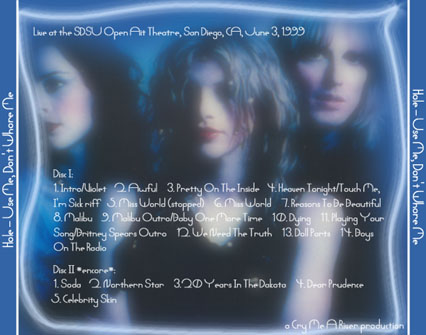 TITLE: Use Me, Don't Whore Me DATE/VENUE: 06/03/99, SDSU Open Air Theatre, San Diego, CA RUNNING TIME: - SOUND QUALITY: - SOURCE: Video tape recorded onto the computer, then copied to cd-r. BOOTLEG BY: Cry Me A River ARTWORK BY: Cry Me A River SETLIST: Disc 1: 1. Intro/Violet 2. Awful 3. Pretty On The Inside 4. Heaven Tonight/Touch Me, I'm Sick riff 5. Miss World (stopped) 6. Miss World 7. Reasons To Be Beautiful 8. Malibu 9. Malibu Outro/Baby One More Time 10. Dying 11. Playing Your Song/Britney Spears Outro 12. We Need The Truth 13. Doll Parts 14. Boys On The Radio Disc 2: 1. Soda 2. Northern Star 3. 20 Years In The Dakota 4. Dear Prudence 5. Celebrity Skin ADDITIONAL INFO: - BOOTLEG REVIEW: - ARTWORK:
