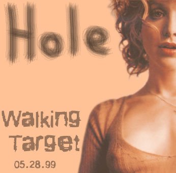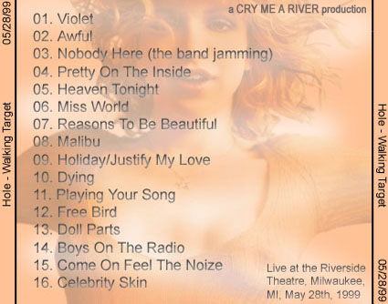 TITLE: Walking Target DATE/VENUE: 05/28/99, Riverside Theatre, Milwaukee, MI. RUNNING TIME: - SOUND QUALITY: - SOURCE: Audio tape transferred to cd-r. BOOTLEG BY: Cry Me A River ARTWORK BY: Cry Me A River SETLIST: 1. Violet 2. Awful 3. Nobody Here (the band jamming) 4. Pretty On The Inside 5. Heaven Tonight 6. Miss World 7. Reasons To Be Beautiful 8. Malibu 9. Holiday/Justify My Love 10. Dying 11. Playing Your Song 12. Free Bird 13. Doll Parts 14. Boys On the Radio 15. Come On Feel The Noise 16. Celebrity Skin ADDITIONAL INFO: "Nobody Here" was the beginning of what Courtney later turned into "But Julian, I'm A Little Older Than You". BOOTLEG REVIEW: - ARTWORK: