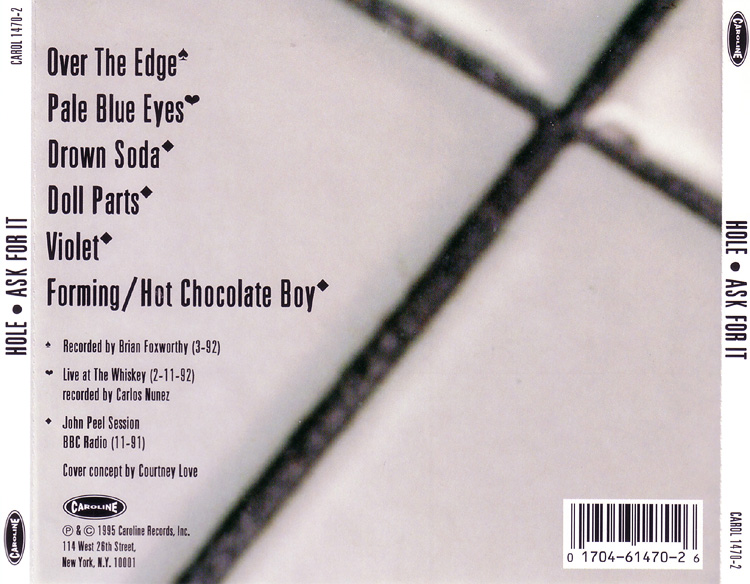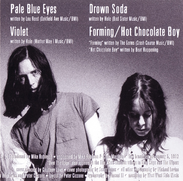 - - - - - - - - - - - - - GENERAL INFO Genre: Length: Label: Caroline Records Date: 1995? Over The Edge written by Greg Sage (Part Music/BMI) Recorded by Brian Foxworthy (3-92) Pale Blue Eyes written by Lou Reed (Oakfield Ave Music/BMI) Live at The Whiskey (2-11-92) recorded by Carlos Nunez Drown Soda written by Hole (Bad Sister Music/BMI) John Peel Session BBC Radio (11-91) Doll Parts written by Hole (Mother May I Music/BMI) John Peel Session BBC Radio (11-91) Violet written Hole (Mother May I Music/BMI) John Peel Session BBC Radio (11-91) Forming/Hot Chocolate Boy "Forming" written by The Germs (Crash Course Music/BMI) "Hot Chocolate Boy" written by Beat Happening Tracks 3, 4, 5, 6: produced by Mike Robinson * engineered by Mike Robinson & Chris MacLean * first broadcast on January 5, 1992 "Over The Edge" also appears on the Tim/Kerr Records tribute to Greg Sage and The Wipers cover concept by Courtney Love * cover photography by Scott Jones * all other photography by Micheal Lavine design by Tom Bejgrowicz and Peter Ciccone * layout by Peter Ciccone * typography by Vincent Li * mastering by West West Side Music - - - - - - - - - - - - - RELEASED ON CAROLINE RECORDS: Format: CD - EP Country of origin: USA? Release date: 1995? Item number: CAROL 1470-2 Tracklist: 1. Over The Edge 2. Pale Blue Eyes 3. Drown Soda 4. Doll Parts 5. Violet 6. Forming/Hot Chocolate Boy Pictures: - - - - - - - - - - - - - |