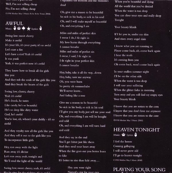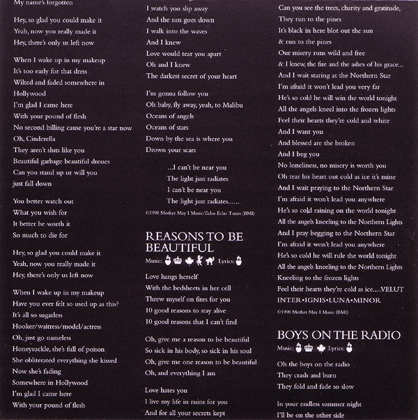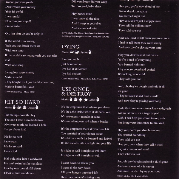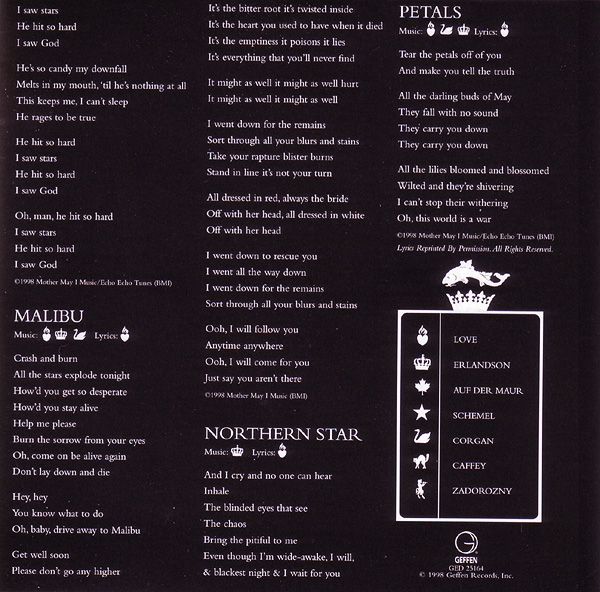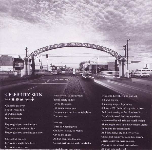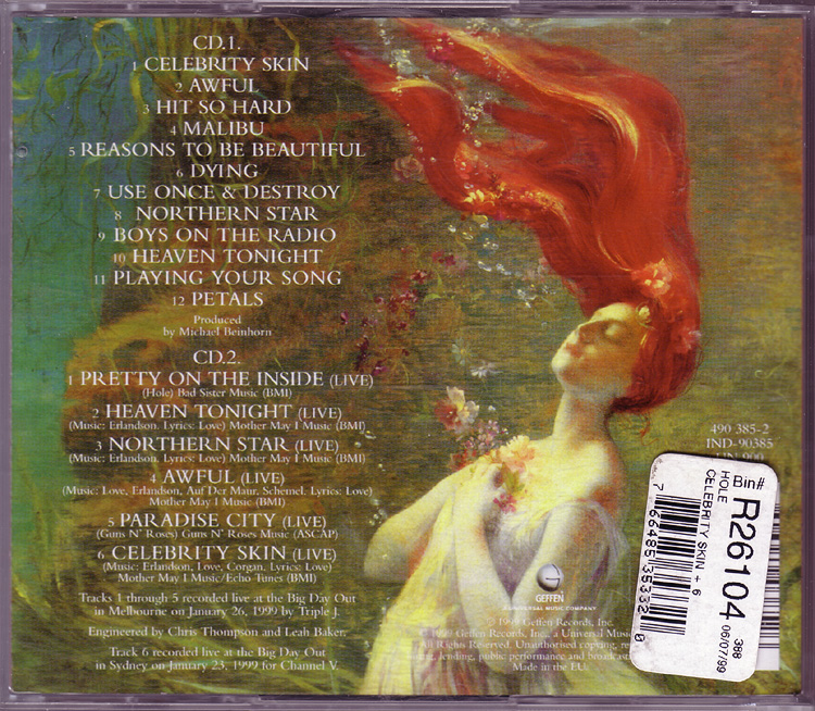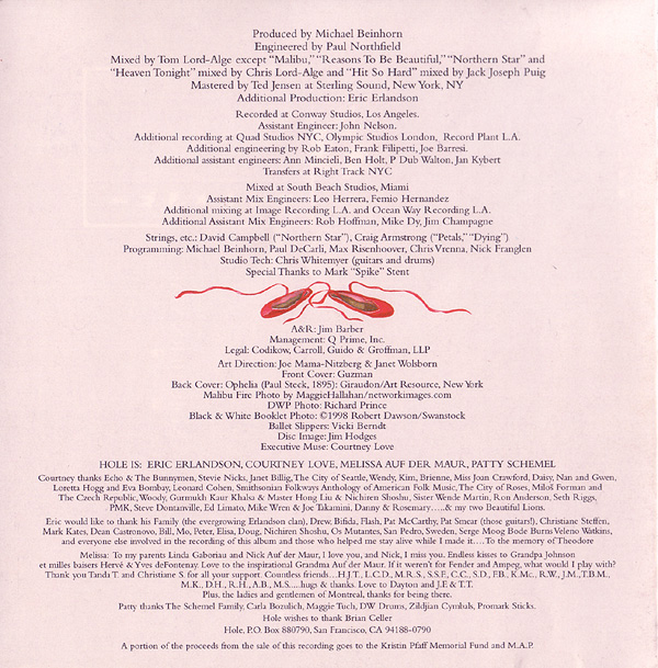 - - - - - - - - - - - - - GENERAL INFO Genre: Hardcore/Punk Label: Geffen Date: September 8, 1998 Musicians: Courtney Love - vocals, guitars Eric Erlandson - guitars Melissa Auf Der Maur - bass, backup vocals Patricia 'Patty' Schemel - drums Produced by Micheal Beinhorn Engineered by Paul Northfield Mixed by Tom Lord-Alge except "Malibu," "Reasons To Be Beautiful," "Northern Star" and "Heaven Tonight" mixed by Chris Lord-Alge and "Hit So Hard" mixed by Jack Joseph Puig Mastered by Ted Jensen at Sterling Sound, New York, NY Additional Production: Eric Erlandson Recorded at Conway Studios, Los Angeles. Assistant Engineer: John Nelson. Additional recording at Quad Studios, NYC, Olympic Studios Lodon, Record Plant L.A. Additional engineering by Rob Eaton, Frank Filipetti, Joe Barresi. Additional assistant engineers: Ann Mincieli, Ben Holt, P Dub Walton, Jan Kybert Transfers at Right Track NYC Mixed at South Beach Studios, Miami Assistant Mix Engineers: Leo Herrera, Femio Hernandez Additional mixing at Image Recording L.A. and Ocean Way Recording L.A. Additional Assistant Mix Engineers: Rob Hoffman, Mike Dy, Jim Champagne Strings, etc.: David Campbell ("Northern Star"), Craig Armstrong ("Petals," "Dying") Programming: Micheal Beinhorn, Paul DeCarli, Max Risenhoover, Chris Vrenna, Nick Franglen Studio Tech: Chris Whitemyer (guitrs and drums) Speciel Thanks to Mark "Spike" Stent A&R: Jim Barber Management: Q Prime, Inc. Legal: Codikow, Carroll, Guido & Groffman, LLP Art Direction: Joe Mama-Nitzberg & Janet Wolsborn Front Cover: Guzman Back Cover: Ophelia (Paul Steck, 1895): Giraudon/Art Resource, New York Malibu Fire Photo by MaggieHallahan/networkimages.com DWP Photo: Richard Prince Black & White Booklet Photo: ©1998 Robert Dawson/Swanstock Ballet Slippers: Vicki Berndt Disc Image: Jim Hodges Executive Muse: Courtney Love HOLE IS: ERIC ERLANDSON, COURTNEY LOVE, MELISSA AUF DER MAUR, PATTY SCHEMEL Courtney thanks Echo & The Bunnymen, Stevie Nicks, Janet Billig, The City of Seattle, Wendy, Kim, Brienne, Miss Joan Crawford, Daisy, Nan and Gwen, Loretta Hogg and Eva Bombay, Leonard Cohen, Smithsonian Folkways Anthology of American Folk Music, The City of Roses, Milos Forman and the Czech Republic, Woody, Gurmukh Kaur Khalsa & Master Hong Liu & Nichiren Shoshu, Sister Wende Martin, Ron Anderson, Seth Riggs, PMK, Steve Dontanville, Ed Limato, Mike Wren & Joe Takamini, Danny & Rosemary.....& my two Beautiful Lions. Eric would like to thank his Family (the evergrowing Erlandson clan), Drew, Bifida, Flash, Pat McCarthy, Pat Smear (those guitars!), Christiane Steffen, Mary Kates, Dean Castronovo, Bill, Mo, Peter, Elisa, Doug, Nichiren Shoshu, Os Mutantes, San Pedro, Sweden, Serge Moog Bode Burns Veleno W atkins, and everyone else involved in the recording of this album and those who helped me stay alive while I made it.... To the memory of Theodore Melissa: To my parents Linda Gaboriau and Nick Auf der Maur, I love you, and Nick, I miss you. Endless kisses to Grandpa Johnson et milles baisers Hervé & Yves deFontenay. Love to the inspirational Grandma Auf der Maur. If it weren't for Fender and Ampeg, what would I play with? Thankyou Tanda T. and Christiane S. for all your support. Countless friends... H.J.T., L.C.D., M.R.S., S.S.F., C.C., S.D., F.B., K.Mc., R.W., J.M., T.B.M., M.K., D.H., R.H., A.B., M.S.....hugs & thanks. Love to Dayton and J.F. & T.T. Plus, the ladies and gentlemen of Montreal, thanks for being there. Patty thanks The Schemel Family, Carla Bozulich, Maggie Tuch, DW Drums, Zildjian Cymbals, Promark Sticks. Hole wishes to thank Brian Celler. Hole, P.O. Box 880790, San Francisco, CA 94188-0790 A portion of the proceeds from the sale of this recording goes to the Kristin Pfaff Memorial Fund and M.A.P. - - - - - - - - - - - - - RELEASED ON GEFFEN: Format: CD - Album Length: ? Country of origin: Made in the EU Release date: September 8, 1998 Item number: GED 25164 Tracklist: 1. Celebrity Skin 2. Awful 3. Hit So Hard 4. Malibu 5. Reasons To Be Beautiful 6. Dying 7. Use Once & Destroy 8. Northern Star 9. Boys On The Radio 10. Heaven Tonight 11. Playing Your Song 12. Petals Pictures: - - - - - - - - - - - - - RELEASED ON GEFFEN: Format: CD - Album Length: ? Country of origin: Japan Release date: October 6, 1998 Item number: ? Tracklist: 1. Celebrity Skin 2. Awful 3. Hit So Hard 4. Malibu 5. Reasons To Be Beautiful 6. Dying 7. Use Once & Destroy 8. Northern Star 9. Boys On The Radio 10. Heaven Tonight 11. Playing Your Song 12. Petals 13. Best Sunday Dress - - - - - - - - - - - - - RELEASED ON GEFFEN: Format: Double CD - Album Length: ? Country of origin: ? (Made in the EU) Release date: August 3, 1999 Item number: GED 25164 + 490 385-2 IND-90385 Additional info: Tracks 1-5 on disc 2 recorded live at the Big Day Out in Melbourne on January 26, 1999, by Triple J. Track 6 on disc 2 recorded live at the Big Day Out in Sydney on January 23, 1999 for Channel V. Tracklist: Disc 1: 1. Celebrity Skin 2. Awful 3. Hit So Hard 4. Malibu 5. Reasons To Be Beautiful 6. Dying 7. Use Once & Destroy 8. Northern Star 9. Boys On The Radio 10. Heaven Tonight 11. Playing Your Song 12. Petals Disc 2 1. Pretty On The Inside (Live) 2. Heaven Tonight (Live) 3. Northern Star (Live) 4. Awful (Live) 5. Paradise City (Live) 6. Celebrity Skin (Live) Pictures: - - - - - - - - - - - - - |