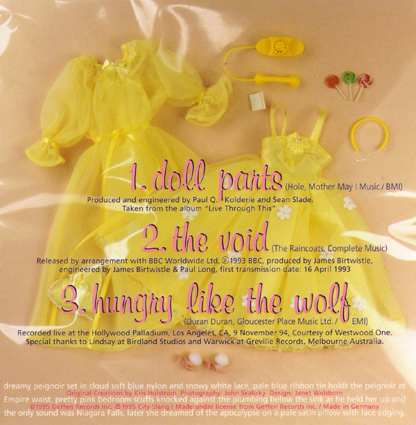 - - - - - - - - - - - - - GENERAL INFO Genre: Length: Label: Geffen and City Slang Date: 1994 coming soon - - - - - - - - - - - - - RELEASED ON CITY SLANG: Format: CD - single Country of origin: ? Release date: 1994 Item number: EFA 04958-2 Additional info: Track 3 recorded live at the Hollywood Palladium, Los Angeles, CA, 9 November 1994. Track 2 is a Raincoats cover, and track 3 is a Duran Duran cover. Tracklist: 1. Doll Parts (Album Version) 2. The Void (Previously unreleased) 3. Hungry Like The Wolf (Live) Pictures: - - - - - - - - - - - - - RELEASED ON GEFFEN: Format: CD - single Country of origin: ? Release date: 1994 Item number: GFSXD 91 Additional info: Track 2 recorded live at the Universal Amphitheater, Los Angeles, CA, 10 December 94. Tracks 3-4 recorded live at the Hollywood Palladium, Los Angeles, CA, 9 November 94. Track 4 is a Young Marble Giants cover. Tracklist: 1. Doll Parts (Album Version) 2. Plump (Live) 3. I Think That I Would Die (Live) 4. Credit In the Straight World (Live) Pictures: - - - - - - - - - - - - - RELEASED ON GEFFEN: Format: CD - single - promotion Length: 3 minutes, 31 seconds Country of origin: USA Release date: 1994 Item number: PRO-CD-4670 Tracklist: 1. Doll Parts (LP Version) Pictures: - - - - - - - - - - - - - |