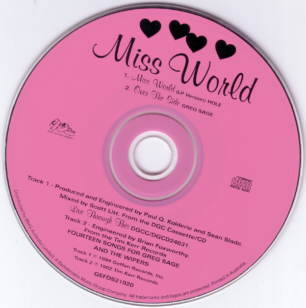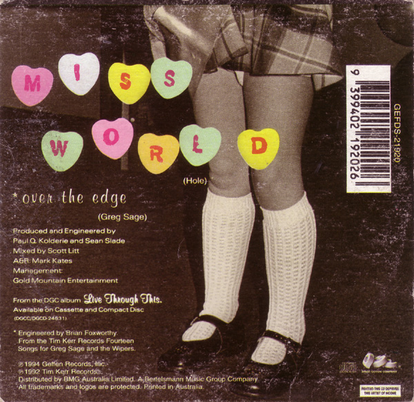 - - - - - - - - - - - - - GENERAL INFO Genre: Label: Geffen Date: 1994 coming soon - - - - - - - - - - - - - RELEASED ON GEFFEN: Format: CD - single Length: ? Country of origin: Australia Release date: 1994 Item number: GEFDS21920 Additional info: While track 2 is listed as "Over The Edge" on the back, it's listed as "Over The Side" on the disc itself. Track 2 is a The Wipers cover, from the Tim Kerr Records "Fourteen Songs For Greg Sage And The Wipers". Tracklist: 1. Miss World (Album version) 2. Over The Edge Pictures: - - - - - - - - - - - - - |