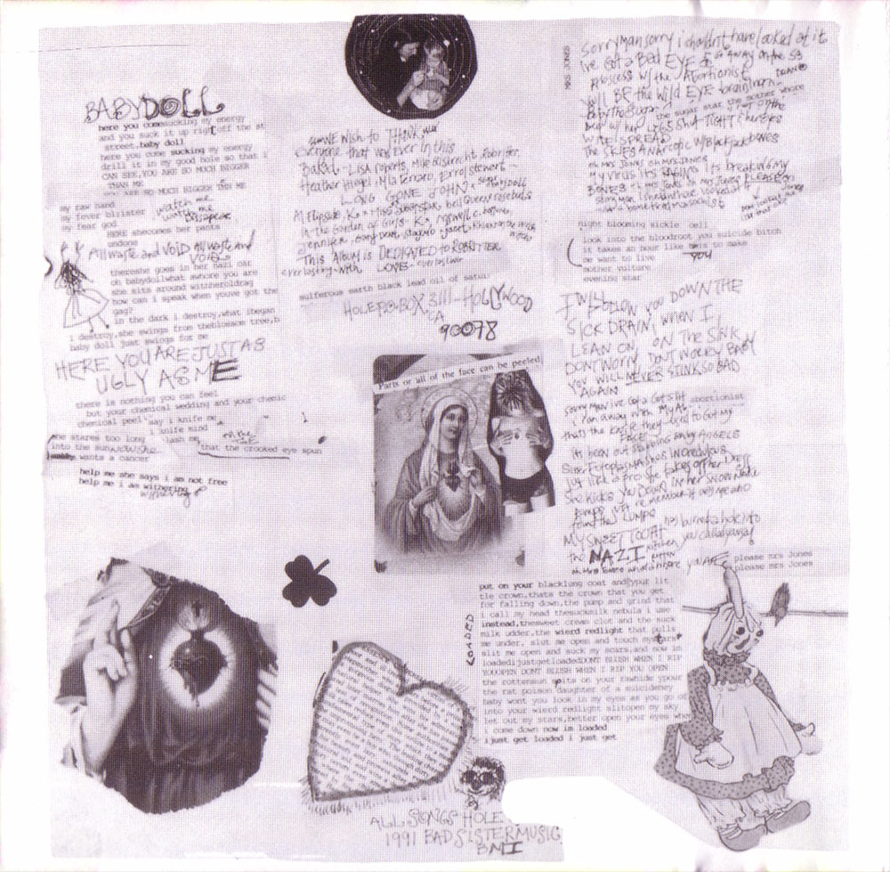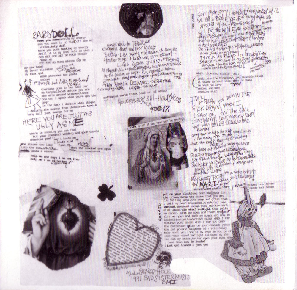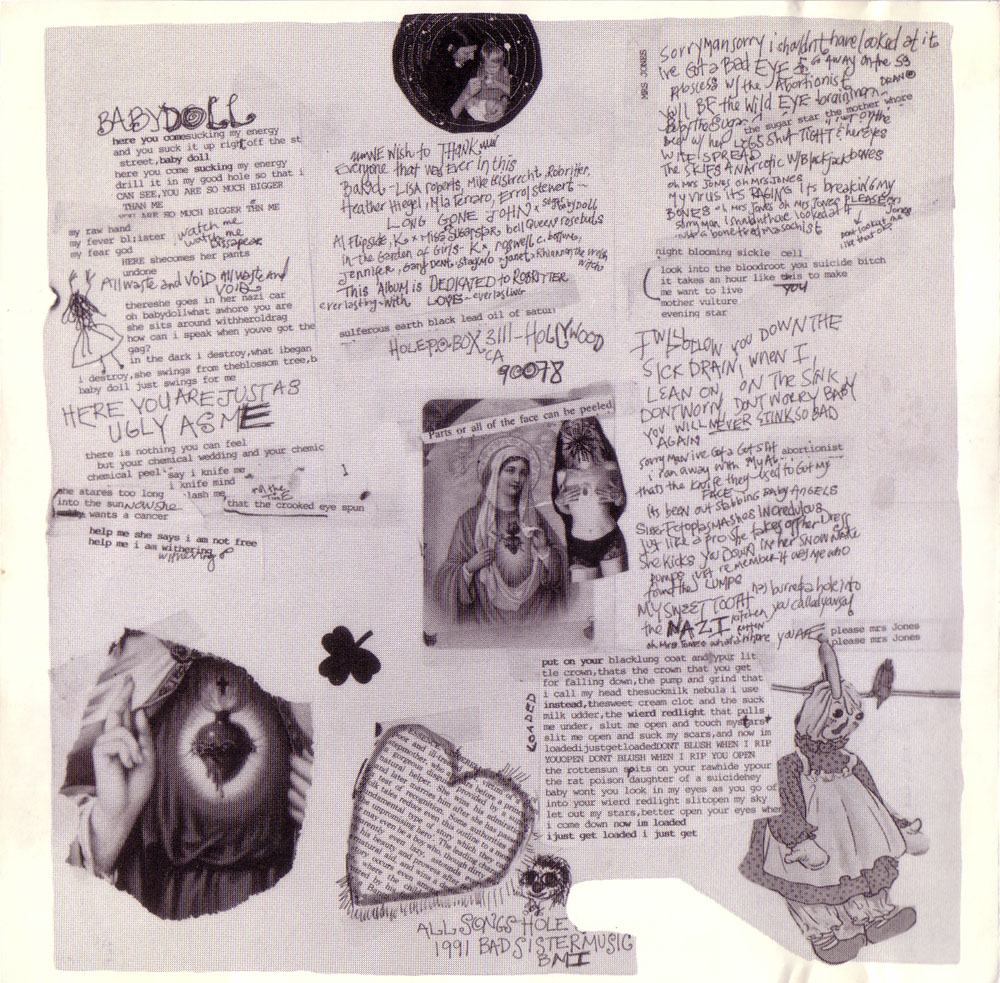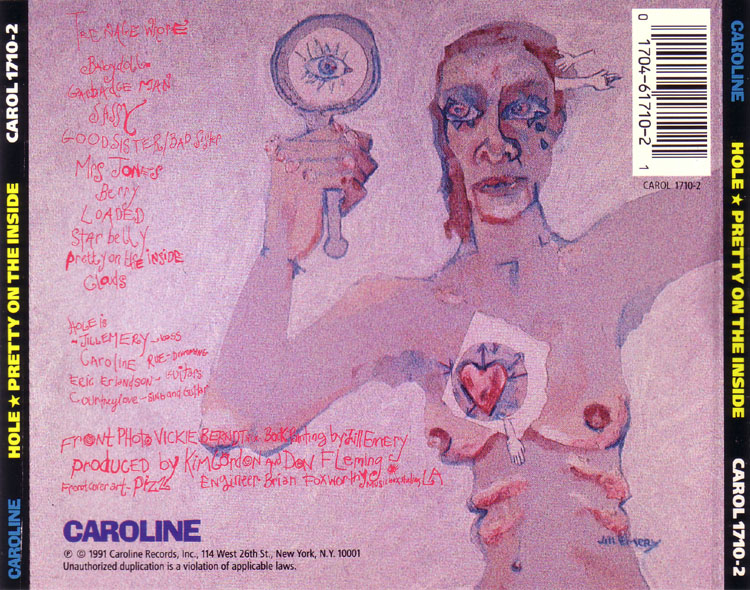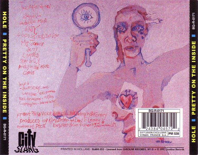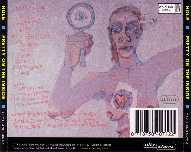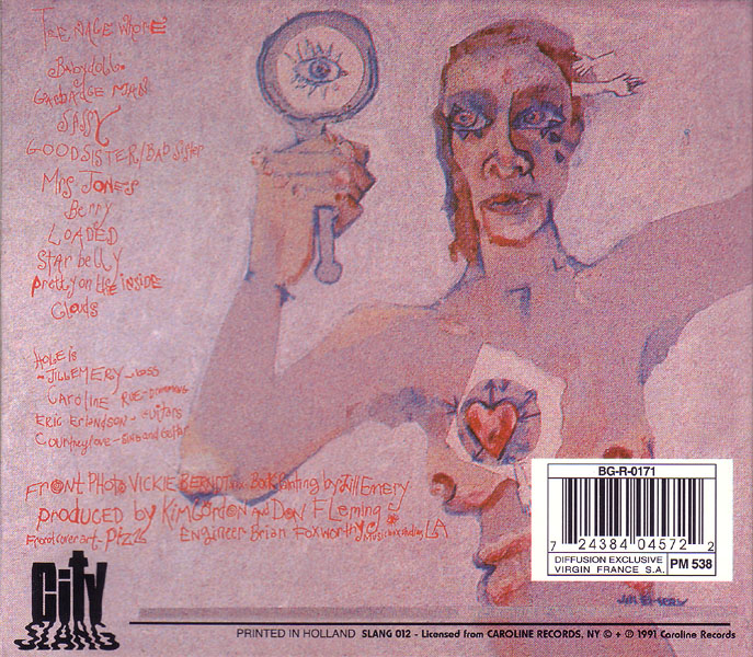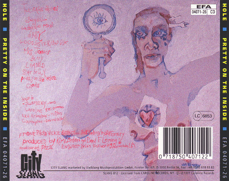 - - - - - - - - - - - - - GENERAL INFO Genre: Grunge/Rock Label/Distributor: Caroline Records (US) and City Slang (Germany/UK) Recorded: Musicbox Studios, Los Angeles, California Producers: Kim Gordon, Don Fleming Engineer: Brian Foxworthy Front Photo: Vickie Berndt Front Cover Art: Pizz Back Painting: Jill Emery Musicians: Courtney Love - vocals, guitars Eric Erlandson - guitars Jill Emery - bass Carolyn Rue - drums Liner notes: ~WE Wish to THaNK~ Everyone that was Ever in this BaNd - LiSA roberts, Mike Geistrecht, Robritter, Heather Hiegel, Mia Ferraro, Errol stewert ~ LONG GONE JOHN * sugar babydoll * Al Flipside, K * Miss sugarstar bell QUEEN rosebuds in the Garden of Girls- K * roswell c. bottuM, Jennifer, Gary DENT, stayMO * janet * Rhiannon the welsh witch This AlbuM is DEDICATED to ROBRITTER everlasting~with LOVE~everlastiNG - - - - - - - - - - - - - RELEASED ON CAROLINE RECORDS: Format: CD - Album Lenght: 38 minutes Country of origin: USA Release date: 1991 Item number: CAROL 1710-2 Tracklist: 1. Teenage Whore 2. Babydoll 3. Garbadge Man 4. Sassy 5. Good Sister/Bad Sister 6. Mrs. Jones 7. Berry 8. Loaded 9. Starbelly 10. Pretty On The Inside/Clouds Pictures: - - - - - - - - - - - - - RELEASED ON CITY SLANG: Format: CD - Album Lenght: 38 minutes Country of origin: Japan, printed in Holland Release date: 1992 Item number: BG-R-0171 Tracklist: 1. Teenage Whore 2. Babydoll 3. Garbadge Man 4. Sassy 5. Good Sister/Bad Sister 6. Mrs. Jones 7. Berry 8. Loaded 9. Starbelly 10. Pretty On The Inside 11. Clouds Pictures: - - - - - - - - - - - - - RELEASED ON CITY SLANG: Format: CD - Album Lenght: 38 minutes Country of origin: Germany Release date: 1991 Item number: EFA 04071-26 Tracklist: 1. Teenage Whore 2. Babydoll 3. Garbadge Man 4. Sassy 5. Good Sister/Bad Sister 6. Mrs. Jones 7. Berry 8. Loaded 9. Starbelly 10. Pretty On The Inside 11. Clouds Pictures: - - - - - - - - - - - - - RELEASED ON CITY SLANG: Format: CD - Album Lenght: 38 minutes Country of origin: UK Release date: 1991 Item number: CITY SLANG 04071-2 Tracklist: 1. Teenage Whore 2. Babydoll 3. Garbadge Man 4. Sassy 5. Good Sister/Bad Sister 6. Mrs. Jones 7. Berry 8. Loaded 9. Starbelly 10. Pretty On The Inside 11. Clouds Pictures: - - - - - - - - - - - - - RELEASED ON CITY SLANG: Format: 12" vinyl - LP Album Lenght: 38 minutes Colour: Blue Country of origin: Germany Release date: 1991 Item number: CITY SLANG 04071-08 Tracklist: 1. Teenage Whore 2. Babydoll 3. Garbadge Man 4. Sassy 5. Good Sister/Bad Sister 6. Mrs. Jones 7. Berry 8. Loaded 9. Starbelly 10. Pretty On The Inside 11. Clouds Pictures: - - - - - - - - - - - - - |