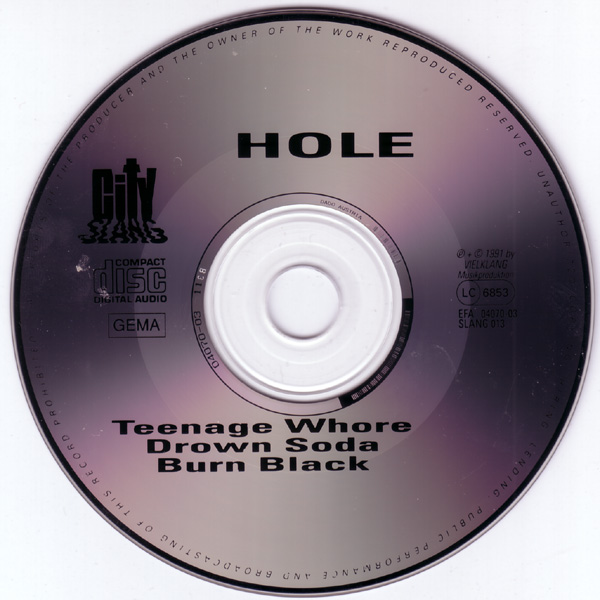 - - - - - - - - - - - - - GENERAL INFO Genre: Length: Label: City Slang Date: 1991 ALL SONGS by HOLE bad Sister MUSIC-BMI- Teen Whore RECORDED AT MUSIC BOX IN LA with Brian Foxworthy DROWN SODA recorded at Fun city w/ Wharton Tiers Burn Black recorded at radio in Tokyo LA Produced by Kim Gordon & Don Fleming Photo by Michael Lavine Hole P.O. BOX 311 *90078* HOLLYWOOD CA - - - - - - - - - - - - - RELEASED ON CITY SLANG: Format: CD - Single Country of origin: Germany? Release date: 1991 Item number: EFA 04070-03 Tracklist: 1. Teenage Whore 2. Drown Soda 3. Burn Black Pictures: - - - - - - - - - - - - - |