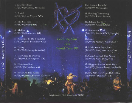 BEAUTY IS CHAOS: 1. Celebrity Skin (01/23/99, Sydney, Australia) 2. Awful (06/01/99, Las Vegas, NV) 3. Hit So Hard (05/15/99, Philadelphia, PA) 4. Malibu (05/29/99, Somerset, WI) 5. Reasons To Be Beautiful (03/10/99, San Fransisco, CA) 6. Dying (01/20/99, Sydney, Australia) 7. Use Once & Destroy (12/11/98, Los Angeles, CA) 8. Northern Star (12/05/98, Fairfax, VA) 9. Boys On The Radio (06/21/99, Paris, France, Acoustic) 10. Heaven Tonight (06/02/99, Mesa, AZ) 11. Playing Your Song (06/22/99, Paris, France) 12. Asking For It (05/02/99, Atlanta, GA) 13. Summer Of '99 (07/01/99, Barrie, ONT, Canada) 14. Drag (01/20/99, Sydney, Australia) 15. Hide Your Love Away (03/14/99, San Fransisco, CA) 16. Cum On Feel The Noise (05/19/99, New York, NY) 17. Biggest Star In Your Sky (06/25/99, Glastonbury, England) 18. It's All Over Now, Baby Blue (12/04/98, Danbury, CT) |