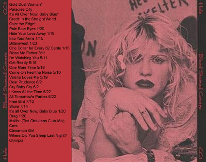 BLOOD STAINED COVERS: 1. Gold Dust Woman 2. Paradise City 3. It's All Over Now, Baby Blue 4. Credit In The Straight World 5. Over The Edge 6. Pale Blue Eyes 1/20/99 7. Hide Your Love Away 1/15/99 8. Into Your Arms 1/15/99 9. Bittersweet 1/23/99 10. One Dollar For Every 62 Cents 1/15/99 11. Bless Me, Father 3/11/99 12. I'm Watching You 5/11/99 13. Get Ready 5/15/99 14. One More Time 5/18/99 15. Come On Feel The Noise 5/19/99 16. Valerie Loves Me 5/19/99 17. Dear Prudence 6/2/99 18. Cry Baby Cry 6/2/99 19. I Know All The Time 6/22/99 20. All Tomorrow's Parties 6/22/99 21. Free Bird 7/10/99 22. Shine 7/14/99 23. It's All Over Now, Baby Blue 1/20/99 24. Drag 1/20/99 25. Malibu (Ted Ottaviano Club Mix) 26. Cars 27. Cinnamon Girl 28. Where Did You Sleep Last Night? 29. Olympia Comment: This is the setlist it appears on the back of the cd. However, the correct setlist would be this: 1. Gold Dust Woman 2. Paradise City 3. It's All Over Now, Baby Blue 4. Credit In The Straight World 5. Over The Edge 6. Hide Your Love Away 1/15/99 7. Into Your Arms 1/15/99 8. Bittersweet 1/23/99 9. One Dollar For Every 62 Cents 1/15/99 10. Bless Me, Father 3/11/99 11. I'm Watching You 5/11/99 12. Get Ready 5/15/99 13. One More Time 5/18/99 14. Come On Feel The Noise 5/19/99 15. Valerie Loves Me 5/19/99 16. Dear Prudence 6/2/99 17. Cry Baby Cry 6/2/99 18. I Know All The Time 6/22/99 19. All Tomorrow's Parties 6/22/99 20. Free Bird 7/10/99 21. Shine 7/14/99 22. It's All Over Now, Baby Blue 1/20/99 23. Drag 1/20/99 24. Malibu (Ted Ottaviano Club Mix) 25. Cars 26. Cinnamon Girl 27. Where Did You Sleep Last Night? 28. Olympia |