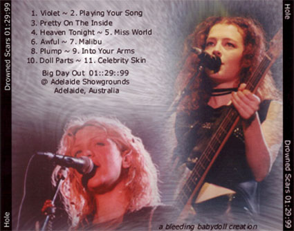 DROWNED SCARS: 1. Violet 2. Playing Your Song 3. Pretty On The Inside 4. Heaven Tonight 5. Miss World 6. Awful 7. Malibu 8. Plump 9. Into Your Arms 10. Doll Parts 11. Celebrity Skin Recorded live at the Big Day Out Festival, Adelaide Showgrounds, Adelaide, Australia, 01/29/99 |