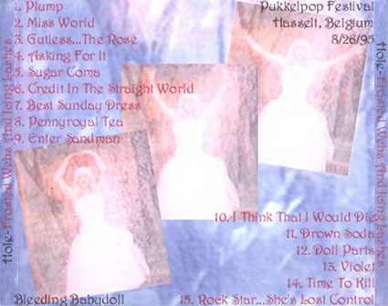 FROSTED WEBS AND ICING LASHES: 1. Plump 2. Miss World 3. Gutless... The Rose 4. Asking For It 5. Sugar Coma 6. Credit In The Straight World 7. Best Sunday Dress 8. Pennyroyal Tea 9. Enter Sandman 10. I Think That I Would Die 11. Drown Soda 12. Doll Parts 13. Violet 14. Time To Kill 15. Rock Star... She's Lost Control Recorded live at the Pukkelpop Festival, Hasselt, Belgium, 08/26/95. |