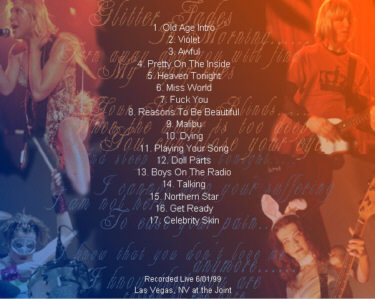GLITTER FADES IN MORNING: 1. Old Age Intro 2. Violet 3. Awful 4. Pretty On The Inside 5. Heaven Tonight 6. Miss World 7. Fuck You 8. Reasons To Be Beautiful 9. Malibu 10. Dying 11. Playing Your Song 12. Doll Parts 13. Boys On The Radio 14. Talking 15. Northern Star 16. Get Ready 17. Celebrity Skin Recorded live 06/01/99 at The Joint, Las Vegas, NV |
