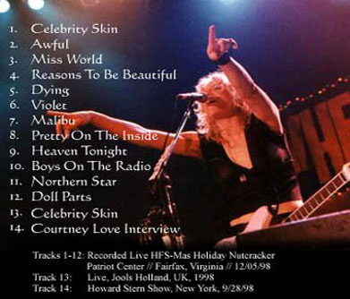 HFS-MAS HOLIDAY NUTCRACKER: 1. Celebrity Skin 2. Awful 3. Miss World 4. Reasons To Be Beautiful 5. Dying 6. Violet 7. Malibu 8. Pretty On The Inside 9. Heaven Tonight 10. Boys On The Radio 11. Northern Star 12. Doll Parts 13. Celebrity Skin 14. Courtney Love Interview Tracks 1-12: Recorded live at the Patriot Center, Fairfax, VA, 12/05/98. Track 13: Live on Jools Holland 1998. Track 14: Courtney live on Howard Stern Show 1998. |