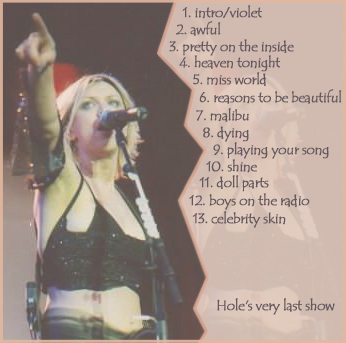 LAST BREATH: 1. Intro/Violet 2. Awful 3. Pretty On The Inside 4. Heaven Tonight 5. Miss World 6. Reasons To Be Beautiful 7. Malibu 8. Dying 9. Playing Your Song 10. Shine 11. Doll Parts 12. Boys On The Radio 13. Celebrity Skin Recorded live at the Thunderbird Stadium, Vancouver, B.C., Canada, 07/14/99. Comment: Pictures on the front and back cover are from the actual show. Bootleg and cover art made by me. |