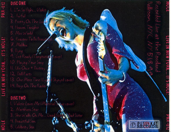 LIVE IN NEW YORK... IT'S HOLE!: Disc 1: 1. I'm So High... Violet 2. Awful 3. Pretty On The Inside 4. Heaven Tonight 5. Miss World 6. Reasons To Be Beautiful 7. Malibu 8. Dying 9. Get Ready 10. Playing Your Song 11. Use Once & Destroy 12. Doll Parts 13. One More Time 14. Boys On The Radio Disc 2: 1. Valerie Loves Me 2. Northern Star 3. She Walks On Me... Good Sister/Bad Sister 4. Beautiful Son 5. Celebrity Skin Recorded live at the Roseland Ballroom, NYC, NY, 05/18/99. |