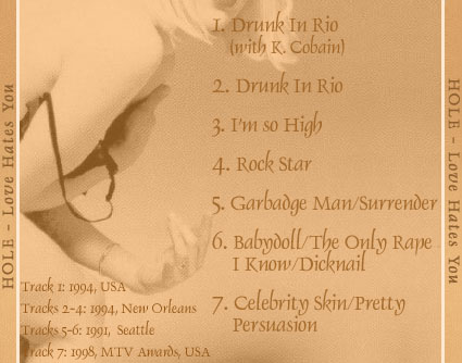LOVE HATES YOU: 1. Drunk In Rio (w/ Kurt) 2. Drunk In Rio 3. I'm So High 4. Rock Star 5. Garbadge Man/Surrender 6. Babydoll/The Only Rape I Know/Dicknail 7. Celebrity Skin/Pretty Persuasion (MTV Awards) Track 1: 1994 USA Tracks 2-4: 1994 New Orleans Tracks 5-6: 1991 Seattle Track 7: 1998 USA Cover art made by me. |