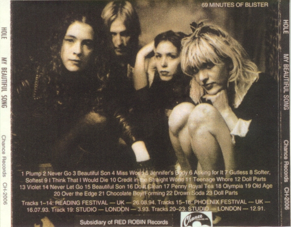 MY BEAUTIFUL SONG: 1. Plump 2. Sugar Coma 3. Beautiful Son 4. Miss World 5. Jennifer's Body 6. Asking For It 7. Gutless 8. Softer, Softest 9. I Think That I Would Die 10. Credit In The Straight World 11. Teenage Whore 12. Doll Parts 13. Violet 14. Sugar Coma 15. Beautiful Son 16. Do It Clean 17. Pennyroyal Tea 18. Olympia 19. Old Age 20. Over The Edge 21. Chocolate Boy/Forming 22. Drown Soda 23. Doll Parts Tracks 1-14: Reading Festival, UK, 08/26/94. Tracks 15-18: Phoenix Festival, UK, 07/16/93. Track 19: Studio, London, 3/93. Tracks 20-23: Studio, London, 12/91. |