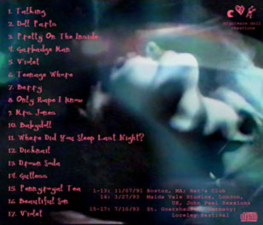 NIGHTBLOOMING SICKLE CELL: 1. Talking 2. Doll Parts 3. Pretty On The Inside 4. Garbadge Man 5. Violet 6. Teenage Whore 7. Berry 8. Only Rape I Know 9. Mrs. Jones 10. Babydoll 11. Where Did You Sleep Last Night? 12. Dicknail 13. Drown Soda 14. Gutless 15. Pennyroyal Tea 16. Beautiful Son 17. Violet Tracks 1-13: Recorded live at Rat's Club, Boston, MA, 11/07/91 Track 14: London, UK, 03/27/93 Tracks 15-17: Loreley Festival, St. Goarshausen, Germany, 07/10/93 |