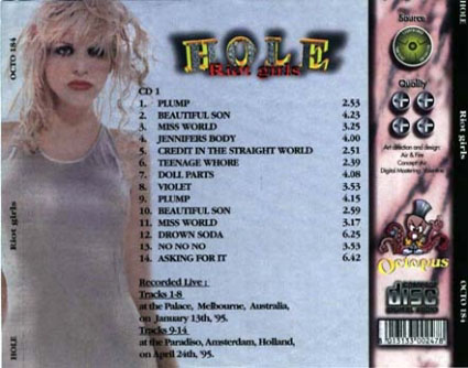 RIOT GIRLS: 1. Plump 2. Beautiful Son 3. Miss World 4. Jennifer's Body 5. Credit In The Straight World 6. Teenage Whore 7. Doll Parts 8. Violet 9. Plump 10. Beautiful Son 11. Miss World 12. Drown Soda 13. No No No 14. Asking For It Tracks 1-8: Recorded live at The Palace, Melbourne, Australia on January 13th '95. Tracks 9-14: Complete concert in Amsterdam on April 24th 1995. After just six songs Courtney decided to stop playing and waded out into the audience attacking fans in an attempt to find the girl who had been throwing water and shouting "You killed Kurt!". |