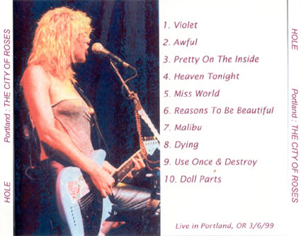 THE CITY OF ROSES: 1. Violet 2. Awful 3. Pretty On The Inside 4. Heaven Tonight 5. Miss World 6. Reasons To Be Beautiful 7. Malibu 8. Dying 9. Use Once And Destroy 10. Doll Parts Recorded live in Portland, OR, 03/06/99. |