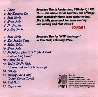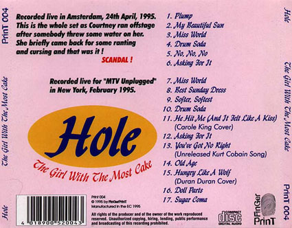 GIRL WITH THE MOST CAKE, THE: 1. Plump 2. Beautiful Son 3. Miss World 4. Drum Soda 5. No, No, No 6. Asking For It 7. Miss World 8. Best Sunday Dress 9. Softer, Softest 10. Drum Soda 11. He Hit Me (and it felt like a kiss) 12. Asking For It 13. You've Got No Right 14. Old Age 15. Hungry Like The Wolf 16. Doll Parts 17. Sugar Coma Tracks 1-6: Recorded live in Amsterdam, 04/24/95. Tracks 7-17: Recorded live MTV Unplugged USA 1995. |