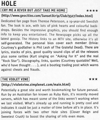 This page is for the publicity this site has actually gotten. A bit self-centered, but hey, I'm proud of this site, so if you don't like it, too bad! Don't let the door hit you on the way out! ;) - - - - - - - - - - - - - Here's an article from the on-line music magazine Addicted To Noise, from a couple of months before 'Celebrity Skin' came out: Hole Widen Gap Between Last Release And Latest - - - - - - - - - - - - - Here's a site-review thingy from the Australian radio station JJJ's guide to good music sites (my site, and Violet Vine were the only ones mentioned): ![]() - - - - - - - - - - - - - And here's a site-review thingy from NME (New Musical Express), from early 1999 or late 1998, I think. ![]() - - - - - - - - - - - - - |